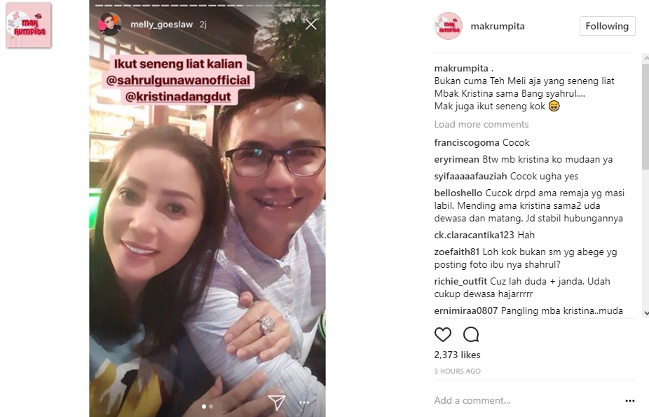Semakin menambah spekulasi netizen, tiba-tiba saja Melly Goeslaw mengunggah ulang foto Kristina dan Sahrul di Instagram Story. Seolah memberi kode adanya kedekatan antara Kristina dan Sahrul, Melly pun mengungkapkan ikut bahagia melihat selebritis yang sama-sama lahir di bulan Mei itu. "Ikut seneng liat kalian @sahrulgunawanofficial @kristinadangdut," tulis Melly.