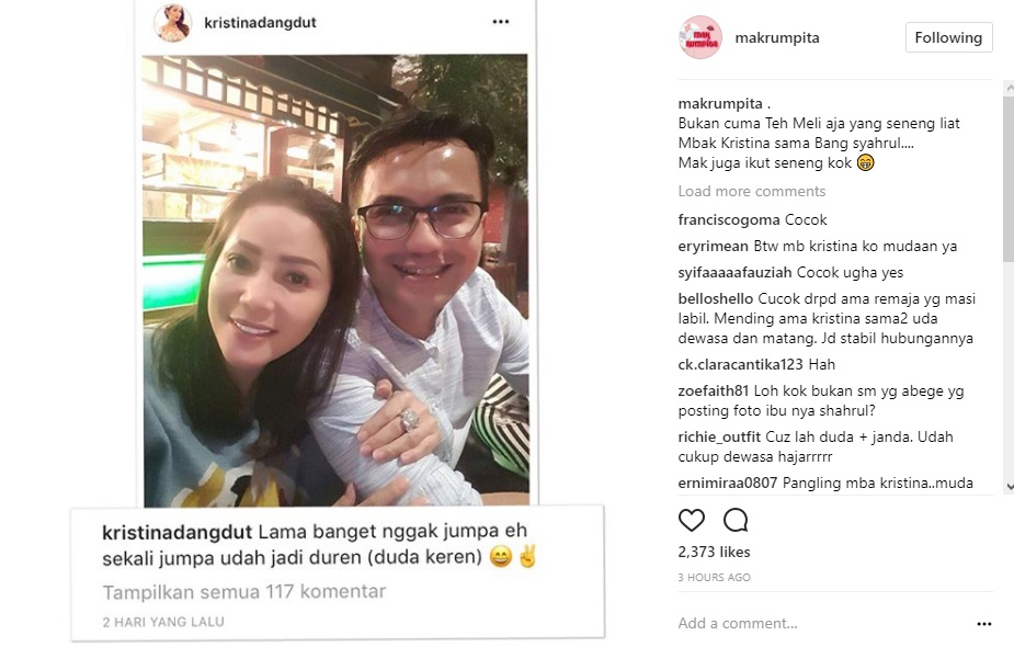"Cocok aja sik gw lihat nya. Udah jodohin aja mereka wahai cupid of love .." kata @d****ez. "cocoooookk nikah aja.. semoga jodoh aamiin..." ujar @pusatgros********murah. "gk serasii ah...cantikn mntan istrinya..mba kristina trlu dewasa unk alul," protes @er******rry. "Dulu kenapa sih cerainya sama mantan istrinya? Sayang banget padahal serasi," imbuh @r******aaa.