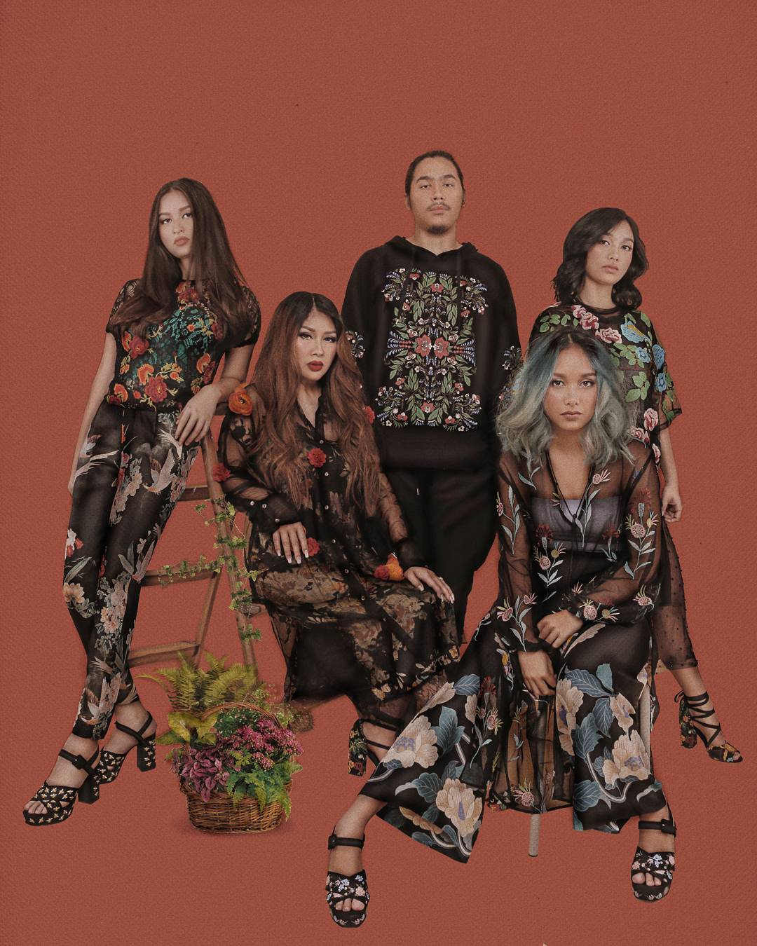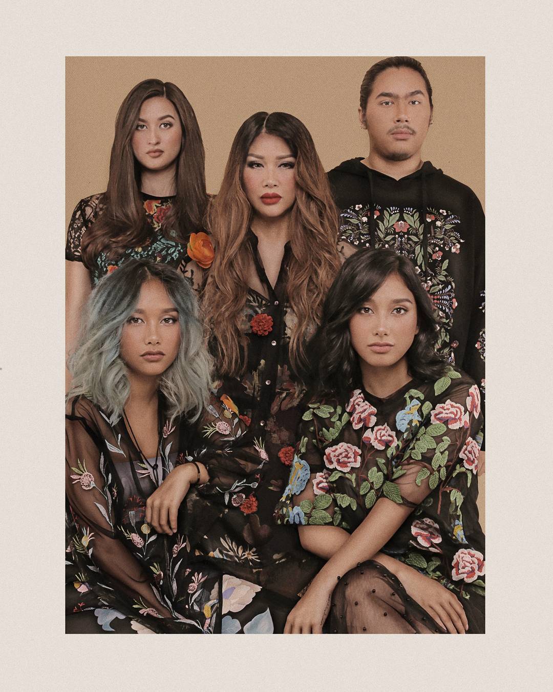 Titi bersama Salwa Mucthar, Salma Mucthar, Daffa Mucthar dan Stephanie Dougharty kompak mengenakan busana bertema bunga untuk pemotretan ini.