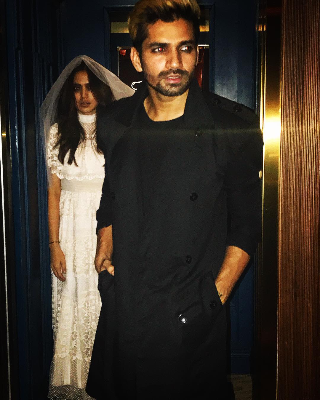 Jedar rupanya juga datang bersama pasangannya, Vishal Singh yang justru tak nampak seram dengan balutan jas dan kaus hitam.