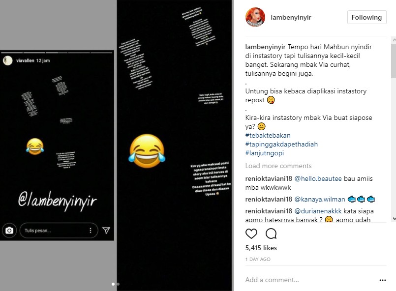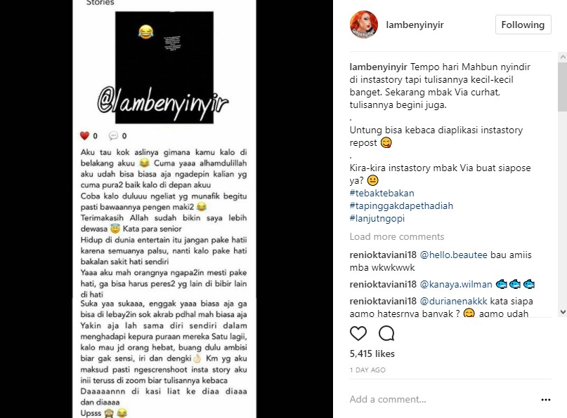Tak cukup sampai disitu, Via pun kembali melayangkan kalimat sindirannya lagi. Ia bahkan meyakini jika seorang yang telah disindirnya itu akan antusias terhadap postingannya. "Yakin aja lah sama diri sendiri dalam menghadapi kepura puraan mereka Satu lagii, kalo mau jd orang hebat, buang dulu ambisi biar gak sensi, iri dan dengki Km yg aku maksud pasti ngescrenshoot insta story aku inii teruss di zoom biar tulisannya kebaca Daaaaannn di kasi liat ke diaa diaaa dan diaaaa Upsss," pungkasnya.
