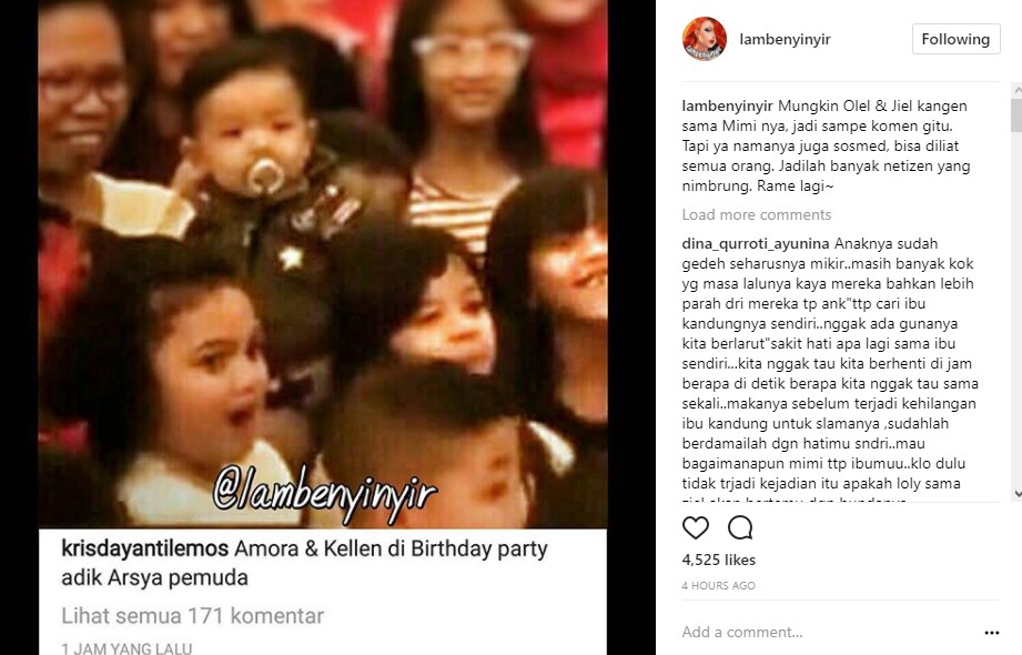 "Pas ultah amora yg dtg jg cuma anak²,jd sama kan," kata @ti*****illy. "Lagi amora ultah jg cuma ziel ama arsya dan arsy yg dtg ashanty dan loly jg ga dtg nah knapa kd dipermasalhkan. Walau bgaimanapun kd ibu kandungnya," ujar @oliv*****stini. "Emangnya si Ashanty pernah dtg ke ultah Amora dan Kellen beberapa wktu lalu? Hanya Arsy dan Arsya juga kan yg datang? Begitu juga ultah Arsya, hanya Amora dan Kellen yang datang. Jadi IMPAS," tukas @tant*****il94.
