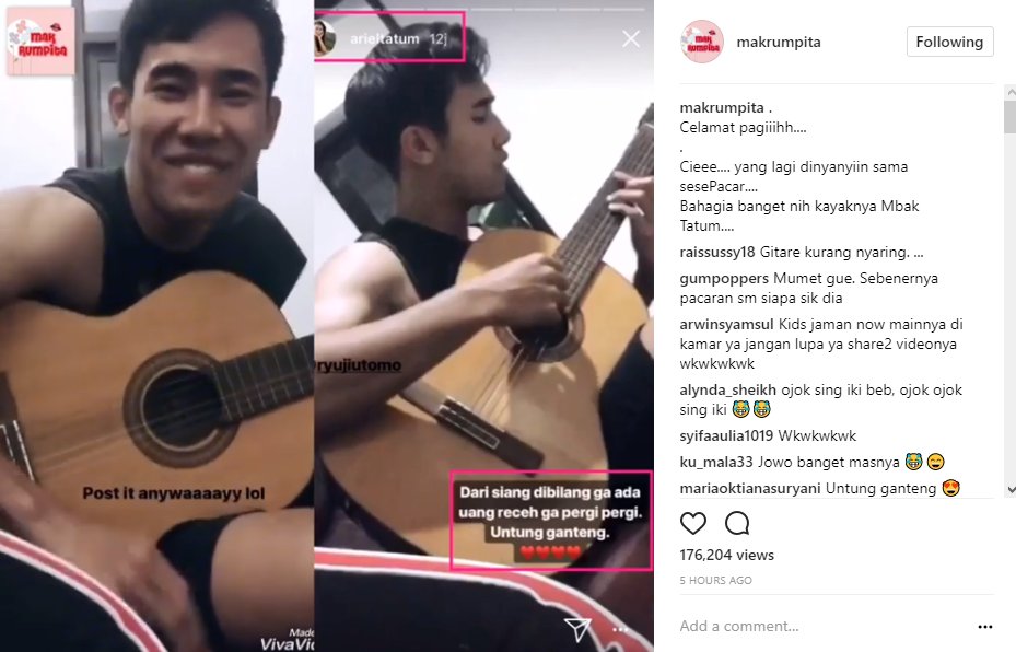 Tak sukses menyanyikan lagu pertama, Ryuji pun kembali melantunkan sebuah lagu dengan lancar. Bahkan, dalam keterangan postingan yang diunggahnya, Ariel tampak memuji ketampanan Ryuji. "Dari siang dibilang ga ada uang receh ga pergi pergi. Untung ganteng," tulis Ariel dalam keterangan postingannya.