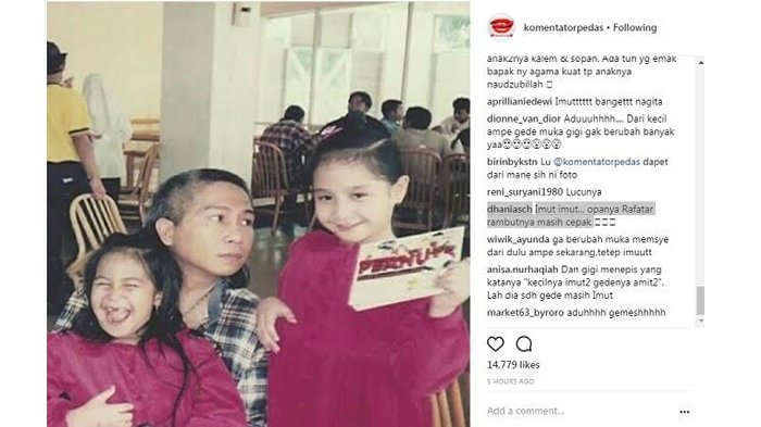 Dalam postingan yang diunggah oleh akun gosip @komentatorpedas itu terlihat foto masa kecil Nagita dan sang adik. Keduanya tengah menghadiri suatu acara dan kompak mengenakan baju berwarna ungu. Nagita terlihat berdiri sambil memasang ekspresi centil. Sedangkan adiknya tertawa lebar dipelukan pria yang diduga adalah sang ayah, Gideon Tengker.