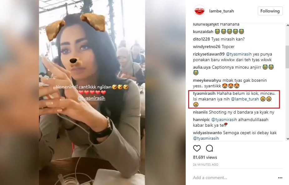 Postingan itu pun semakin menarik, bahkan mengundang kehebohan netizen saat diunggah ulang oleh akun gosip @lambe_turah. Bahkan, tak sedikit netizen yang ikut senang saat mengetahui kabar kehamilan Tyas.