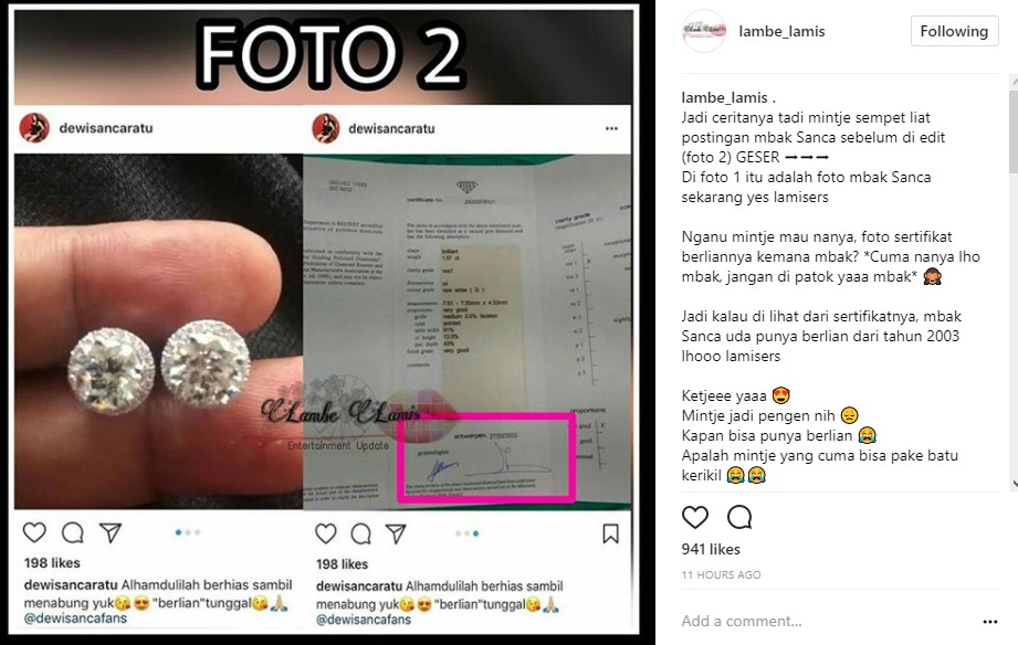 Postingan Dewi Sanca itu pun cukup menarik perhatian akun gosip @lambe_lamis. Terlebih setelah akun gosip tersebut seolah menemukan hal mengganjal di dalam sertifikat perhiasan. "Nganu mintje mau nanya, foto sertifikat berliannya kemana mbak? *Cuma nanya lho mbak, jangan di patok yaaa mbak* Jadi kalau di lihat dari sertifikatnya, mbak Sanca uda punya berlian dari tahun 2003 lhooo lamisers," tulis akun gosip tersebut, Selasa, 31 Oktober.