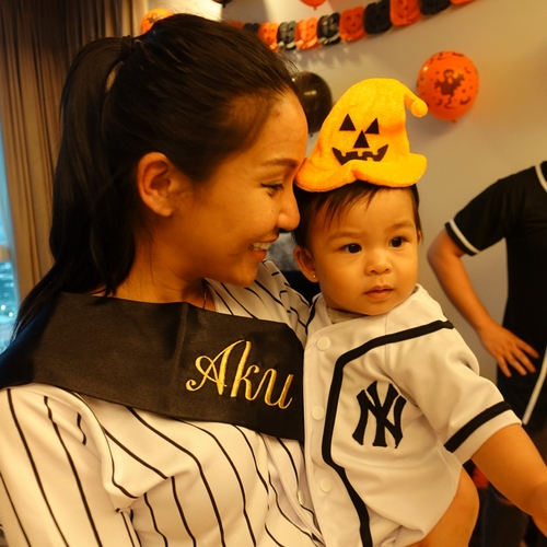 Dandanan labu ala Nastusha itu diimbangi dengan semacam baju jersey yang kembaran dengan ayah ibunya.