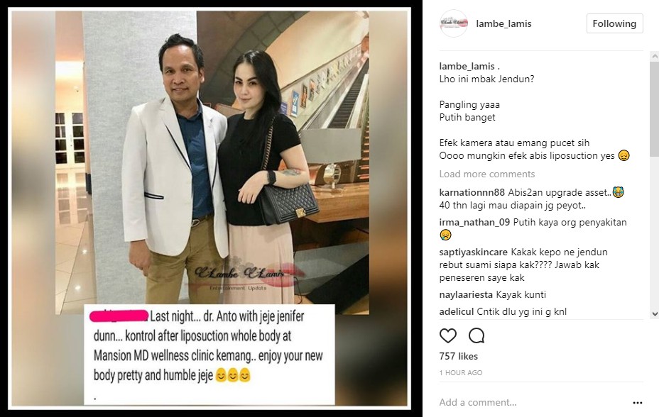 Melalui postingan yang diunggah ulang oleh akun gosip @lambe_lamis, terlihat Jedun tengah berpose dengan seorang dokter di sebuah klinik kebugaran. Menurut keterangan foto yang beredar, Jedun tengah melakukan kontrol setelah melakukan sedot lemak pada tubuhnya. "last night...dr.Anto with jeje jenifer dunn.. kontrol after liposuction whole body at Mansion MD wellness clinic Kemang..enjoy your new body pretty and humble jeje (tadi malam ... dr.Anto dengan jeje jenifer dunn .. kontrol setelah sedot lemak seluruh tubuh di klinik kebugaran MD Mansion Kemang..Nikmati tubuh baru anda yang cantik dan rendah hati jeje," tulis narasumber yang tak disebutkan naanya itu.