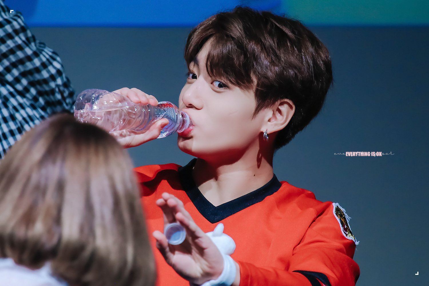 Fans beberapa kali memergoki Jungkook minum dengan mulut yang mengelilingi bagian atas botol, mirip seperti adik bayi yang sedang minum dari botol susunya. Tak heran jika fans semakin gemas maksimal dengan maknae Bangtan Boys ini. Imut banget!