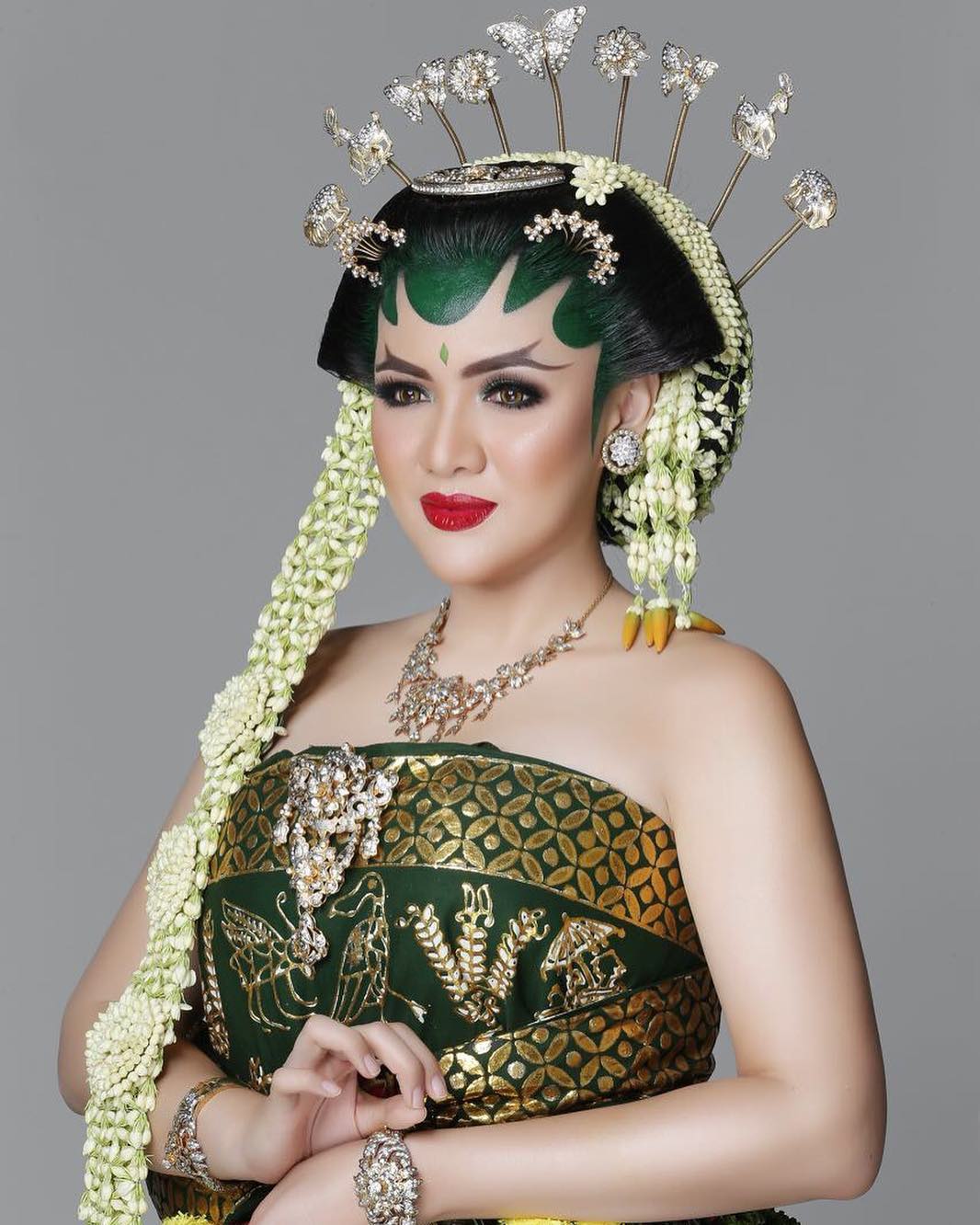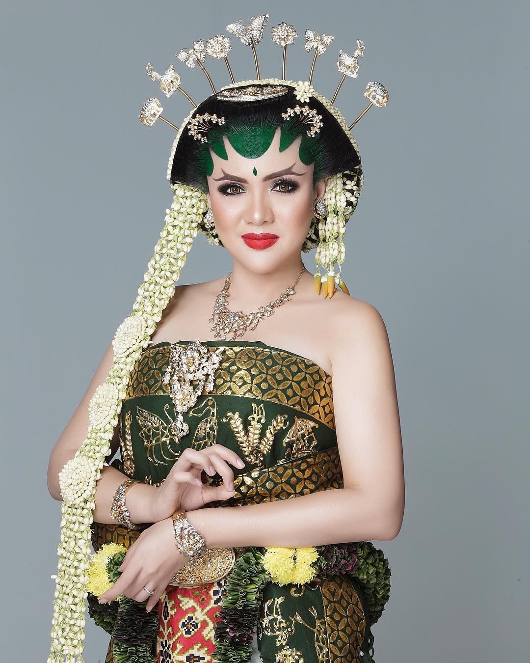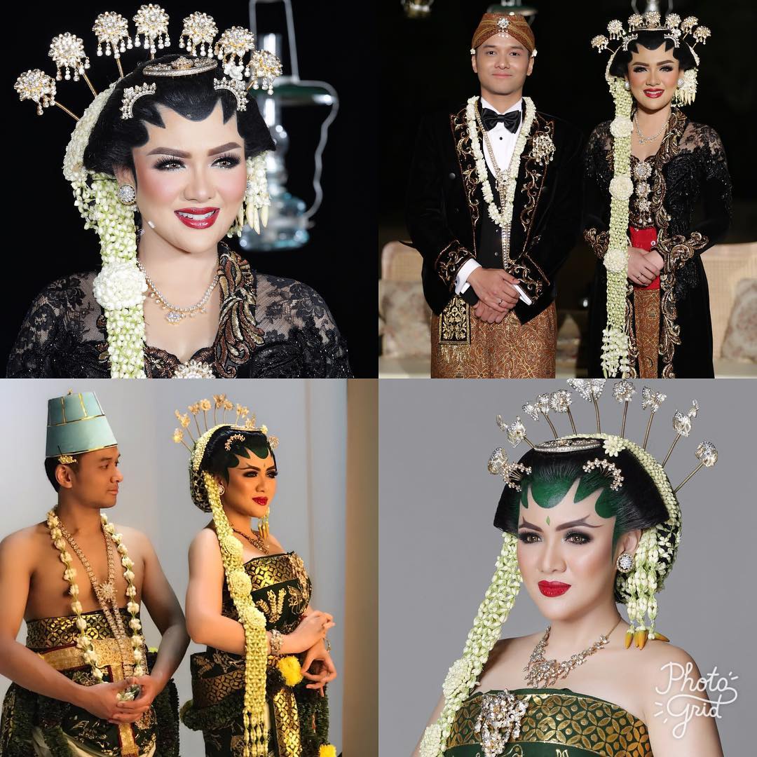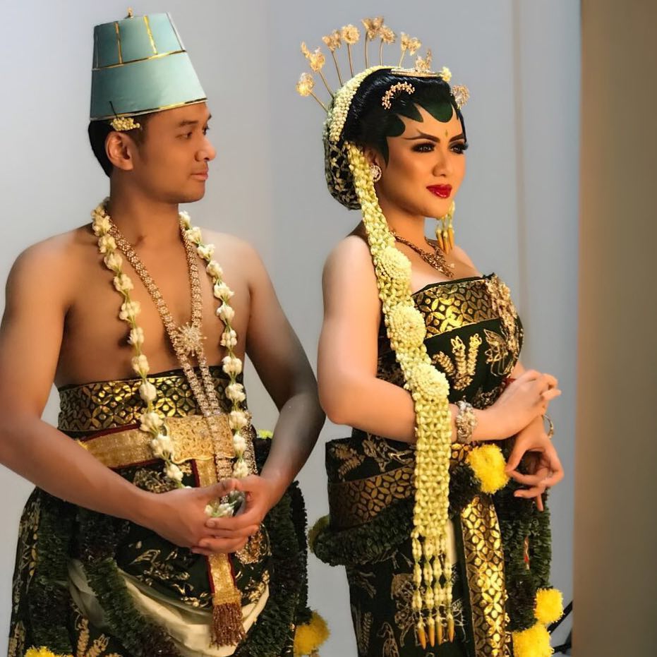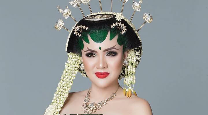Vicky Shu mengenakan paes dan riasan ala Solo basahan yang membuatnya sangat anggun dan berbeda.