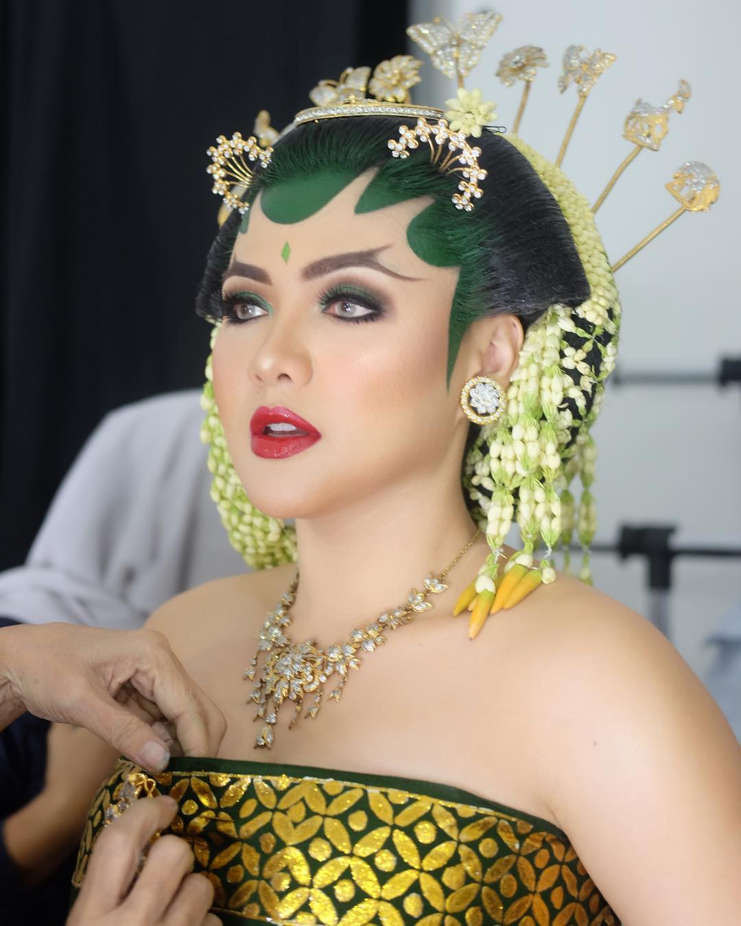 Kembali mengenakan paes Jawa, Vicky Shu sukses membuat pangling publik dengan riasan ala Solo Basahan-nya ini.