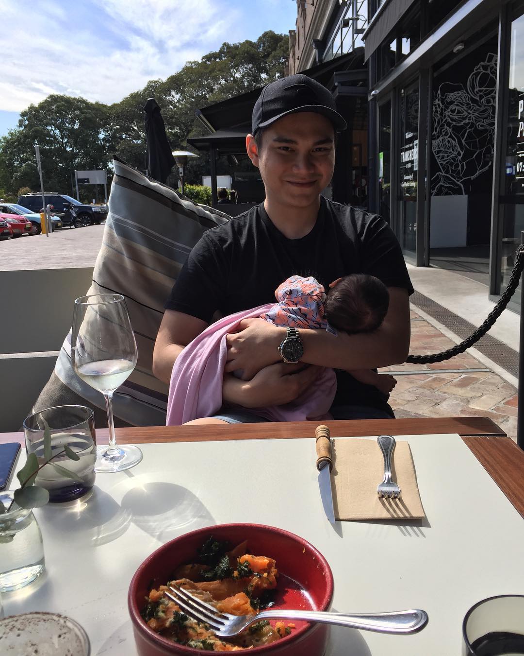 Brie rupanya tak mau ketinggalan makan siang bersama kedua orang tuanya. Ia nampak menggeliat manja digendongan sang ayah, Vicky Kharisma.