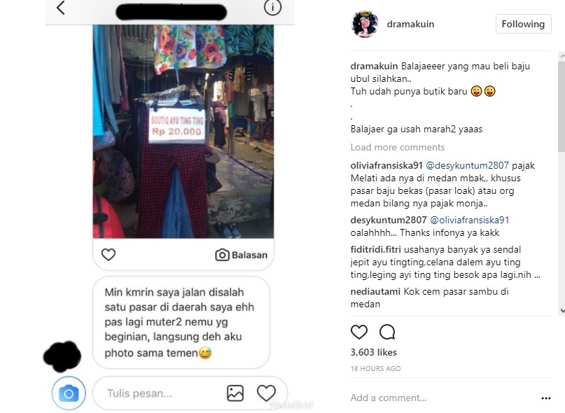 Baru-baru ini, akun @dramakuin membagikan postingan terkait bisnis fashion Ayu Ting Ting. Seorang narasumber yang tak disebutkan namanya mengirim sebuah foto pada akun tersebut. Menurut keterangannya, saat sang narasumber mengunjungi salah satu pasar tradisional, ia menemukan hal yang berkaitan dengan bisnis fashion Ayu Ting Ting.