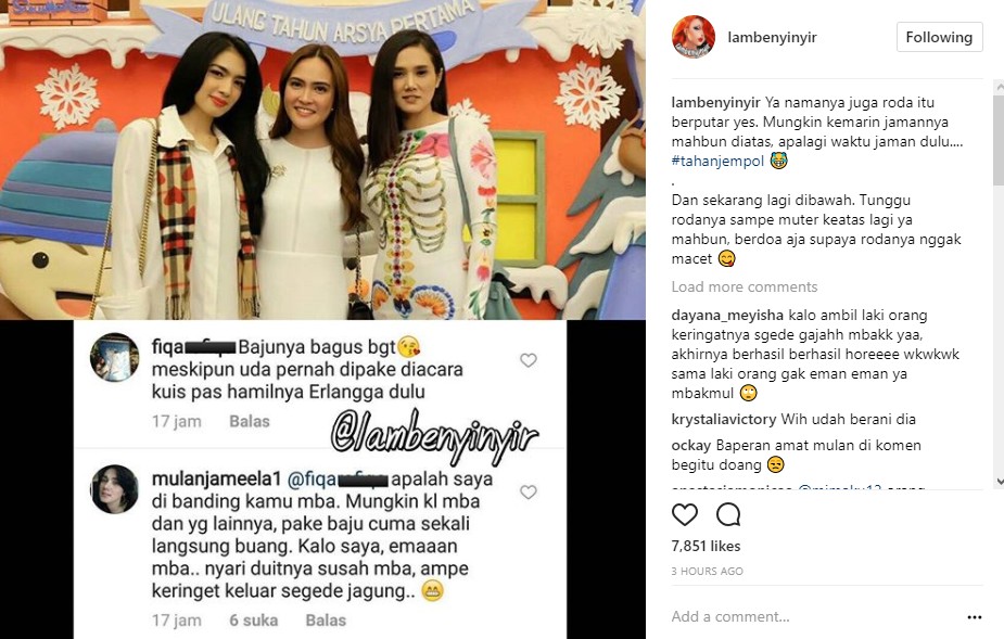 "Kok dia baper yaa padahal si mbak netijen ga ngomong aneh2," sindir @wi****uliaaa. "Padahal komennya ga jjelek cuma bilang bajunya bagus walaupun udah pernah dipake... mba mul baperan deh..." imbuh @trin****al. "Saya bukan pembenci mulan jameela , cm ky ny ini trlalu baper mulan ny, klo d baca komen ny biasa aj, mlh memuji lho.." timpal @na***_shop.