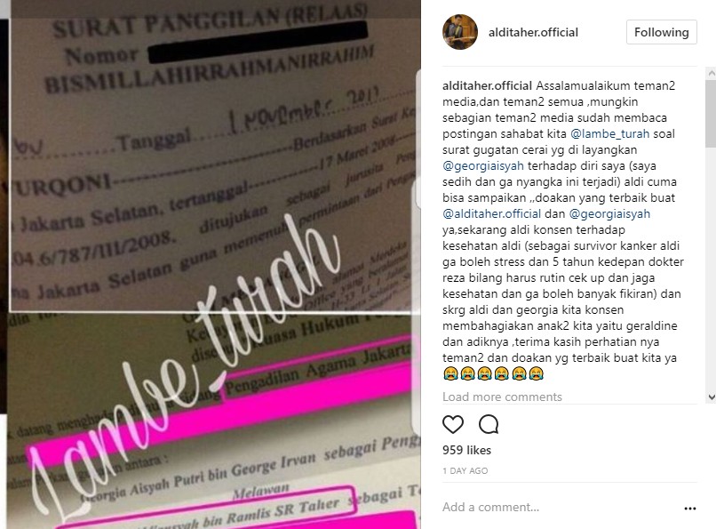 Selang beberapa waktu, Aldi kembali dirundung masalah. Siapa sangka, istrinya, Georgia tiba-tiba melayangkan gugatan cerai padanya, Selasa, 1 November 2017. Tanpa diketahui alasan pasti surat gugatan cerai itu pun telah beredari di dunia maya.