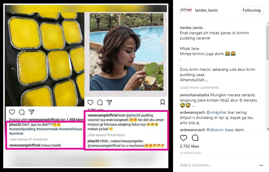 Jane pun tampak tak keberatan untuk membagi puding buatannya. Vanessa tampak lahap saat menikmati puding buatan wanita yang dulu sempat ia sindir. "kaak @jshaz26 pudding caramel nya enak bangeettt liat deh aku ampe manyun gt fotonyaa sangking fokus nya makasi ya kak," tulis Vanessa sambil mengunggah fotodi Instagram pribadinya. "Hihihi...makaci kesayanganku @vanessaangelofficial luv u muchoooo," balas Jane dalam kolom komentar.