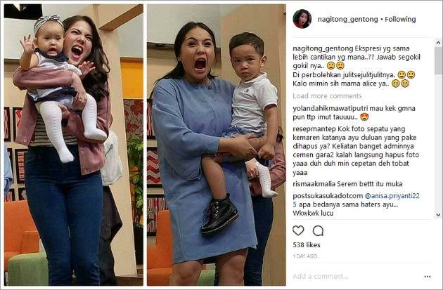 Nagita Slavina menuai pujian hingga hinaan atas pose mangap bersama Rafathar yang beredar luas di Instagram.