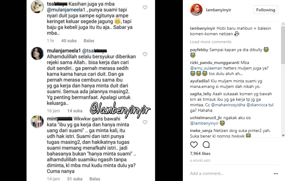 Bukan marah, Mulan justru membalas komentar itu dengan santai. "Alhamdulillah selalu bersyukur diberikan rezeki sama Allah.. bisa kerja dan cari duit sendiri.. ga pernah merasa sedih karna harus cari duit. Dan ga pernah merasa cemburu sama ibu yg ga kerja dan hanya minta duit dari suami. Semua ada jalannya masing2. Yg penting bermanfaat. Apalagi untuk keluarga.." balas Mulan.