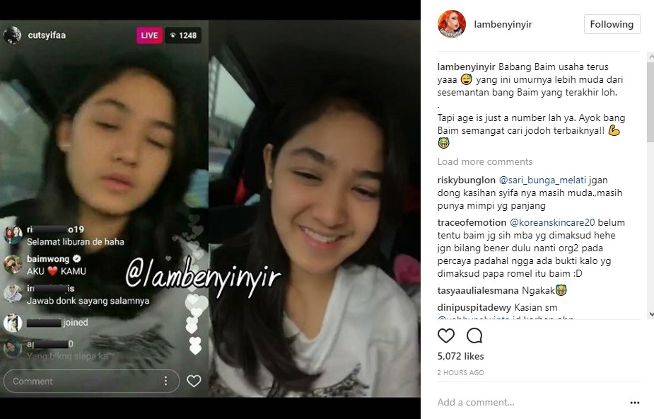 Sontak, postingan yang diunggah ulang oleh akun gosip @lambenyinyir itu pun menuai berbagai komentar. "Baim mending cari yg matengan dikit lah. Yg cewek msh anak2 banget, pasti yg cewek mau kejer karir dan sekolahnya dlu," kata @gallery_t******rt. "Cita2nya pengin kawin tapi seleranya abegeh, mana mau di ajak serius bang," sindir @po****_1004. "Baim umur udah tua bukannya mau serius cri pendamping hidup, malah kayak gitu, padahal sm vebby kmren kan udah gembar gembor mau nikah," cibir @vinia*****eriska1505.