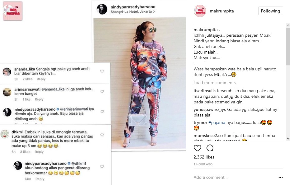 Meskipun demikian, netizen lainnya tampak membela Nindy. Ia bahkan menilai penampilan Nindy itu cukup keren. Siapa sangka, Nindy pun merasa tergugah untuk ikut membalas komentar dua netizen itu. "Iya diemin aja. Dia yang aneh. Baju biasa aja dibilang aneh," kata Nindy.