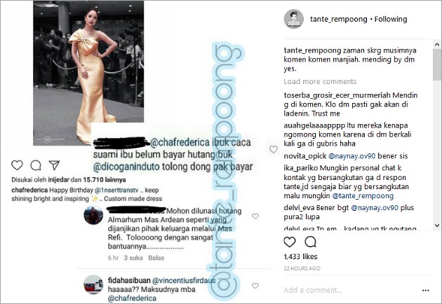 Sementara itu, komentar pemilik akun yang menagih hutang itu kemudian banyak beredar di media sosial. Salah satunya bahkan diposting ulang akun gosip Instagram @tante_rempong.