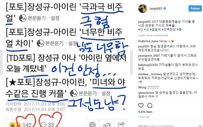 Tidak lama usai acara berlangsung, sang penyiar JTBC ini pun membalas tulisan artikel-artikel berita yang memojokkan dirinya dengan cara yang cukup netral. Dalam tulisannya di sosmed , Jang Sung Gyu merespon balik kritikan tersebut dan mengatakan dia telah puas dengan penampilannya. Kepada judul-judul nyinyir yang memberitakannya itu, Jang Sung Gyu membalasnya satu per satu dengan menggarisbawahi warna biru. Judul berita "Visual yang sangat kontras" dibalasnya dengan jawaban "Paling buruk sekali", kemudian judul "Terlalu banyak perbedaan dalam visual" dibalasnya dengan jawaban "Kamu juga berlebihan", judul "Dia beruntung sekali bisa bersanding disamping Irene" dibalasnya dengan jawaban "Yang satu ini, aku setuju ... ", dan yang terakhir "Mirip Beauty and the Beast" dibalasnya dengan jawaban "Apakah seburuk itu?"
