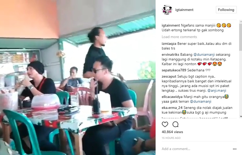 "Emanggggg min. Pernh ketemu jg gw di puncak, disapa dia jg nyapa balik ga ada buang muka trus senyum nya ga maksa. Loveee @anji.manji," puji @irr****n. "Setuju bgt caption nya.. kepribadiannya baik banget dan intelektual nya tinggi.. jarang ada musisi spt ini paket lengkap .. sukses trus manji. @anji.manji," kata @ze****ut. "Pernah komen di ignya : manji td aku liat di citos sm saga. Eh di mention sm manji : kenapa gk disapa?. Yampun kirain komen gw gk kebaca, mlh dijawab pula sm manji. Seneng gw, brarti ramah," imbuh @lusi******nisandila.