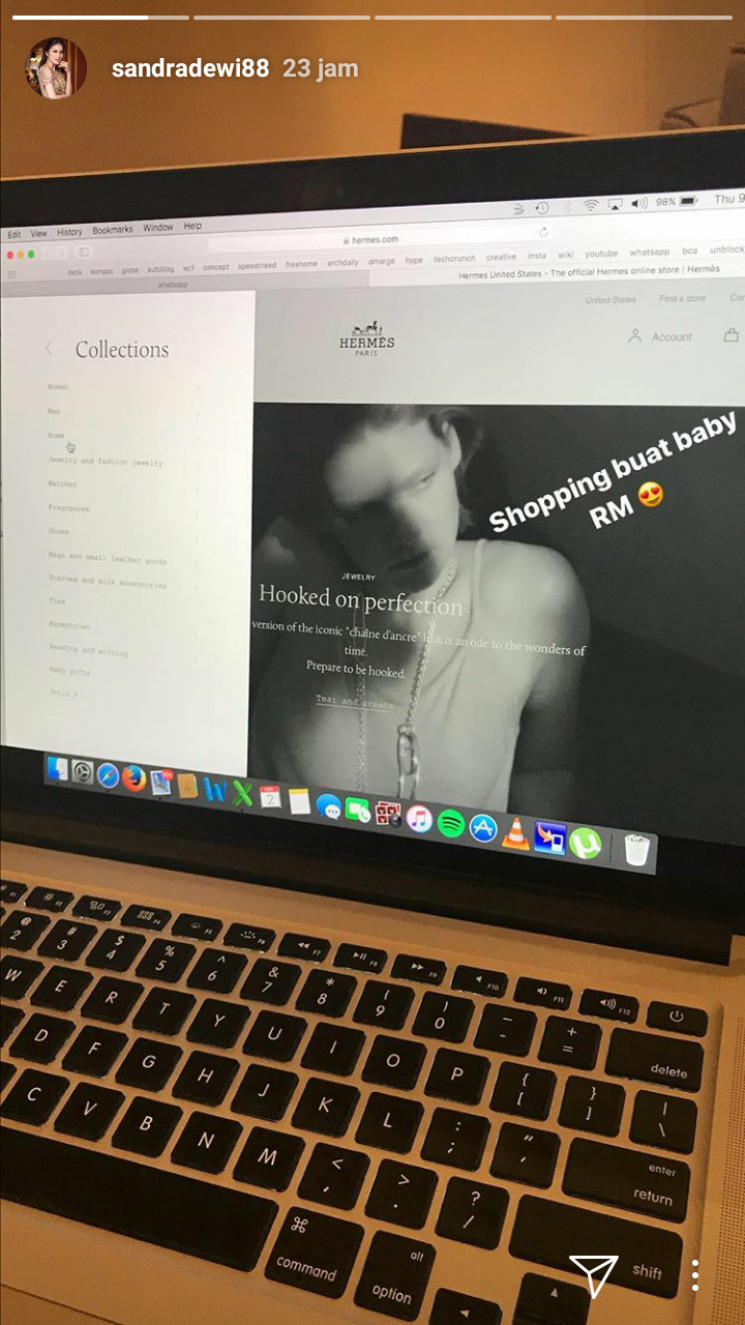 Hal tersebut dapat dilihat dari Instagram Storis Sandra. Terlihat ia tengah membuka sebuah halaman situs Hermes. "Shopping buat baby RM," tulisnya sebagai keterangan. Sandra Dewi sendiri memang dikenal sebagai salah satu selebritis Indoensia yang gemar mengenakan barang-barang bermerek. Ia kerap kali tampil dengan membawa barang fashion dari Balenciaga, Gucci, hingga Louis Vuitton.