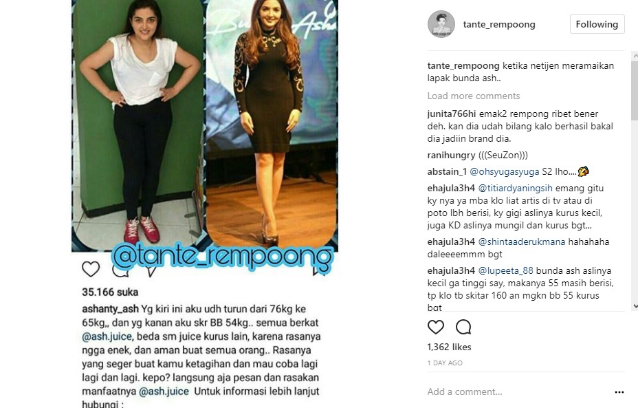 Terkait hal tersebut, baru-baru ini, Ashanty membagikan foto masa lalu yang terlihat lebih berisi serta disandingkan dengan potret masa kini. Bukan sekedar menunjukkan foto tanpa makna, ternyata Ashanty juga memperkenalkan bisnis barunya berupa jus pelangsing.