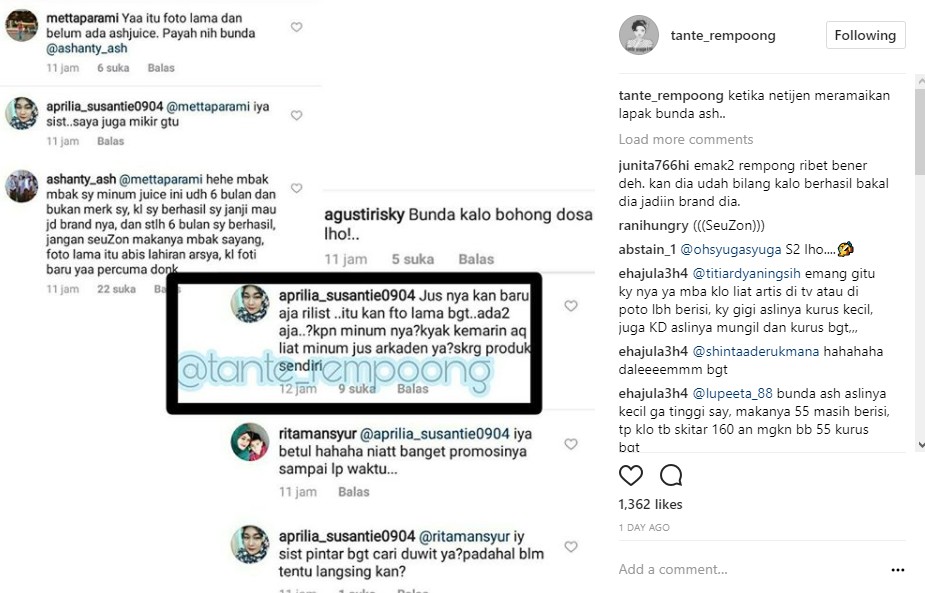 Tak sampai disitu, sejumlah netizen juga menaruh curiga pada Ashanty. Mereka menilai, bisnis jus milik Ashanty baru saja dirilis, sedangkan foto yang diunggah adalah potret lama. Masih belum lelah, Ashanty pun dengan sabar menjawab tudingan netizen. "hehe mbak mbak sy minum juice ini udh 6 bulan dan bukan merk sy, kl sy berhasil sy janji mau jd brand nya, dan stlh 6 bulan sy berhasil, jangan seuZon makanya mbak sayang, foto lama itu abis lahiran arsya, kl foto baru yaa percuma donk," imbuh Ashanty.