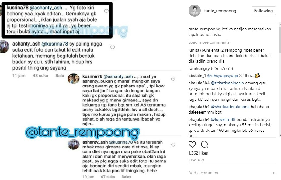Alih-alih antusias, tak sedikit netizen justru menyindir Ashanty. Salah satu netizen bahkan menyebut bahwa Ashanty telah mengedit fotonya. Usai mendapat kritikan itu, Ashanty pun menampik tudingan bahwa dirinya telah mengedit foto. "sy paling ngga suka edit foto dan takut kl edit malu ketahuan, memang begitulah bentuk badan sy dulu stlh lahiran, hidup hrs positif thingking sayang," jawab Ashanty.