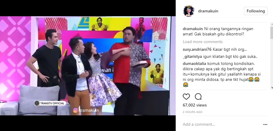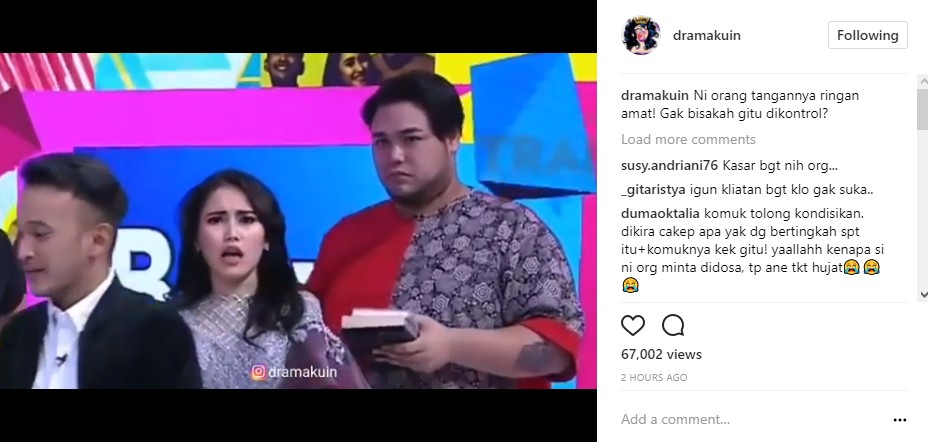 Di sisi lain, ekspresi Igun usai menerima perlakuan Ayu Ting Ting pun tak kalah menghebohkan netizen. "Fokus ke muka nya ka igun kaya gak suka gtu..." seru @rir*****ditya. "Igun sampe kaget gituhh lohhh," tutur @putry_ri*****89. "Igun kayaknya beneran kesel deh pas japok nampol mukanya. Tp igun masih profesional," imbuh @di****h__.