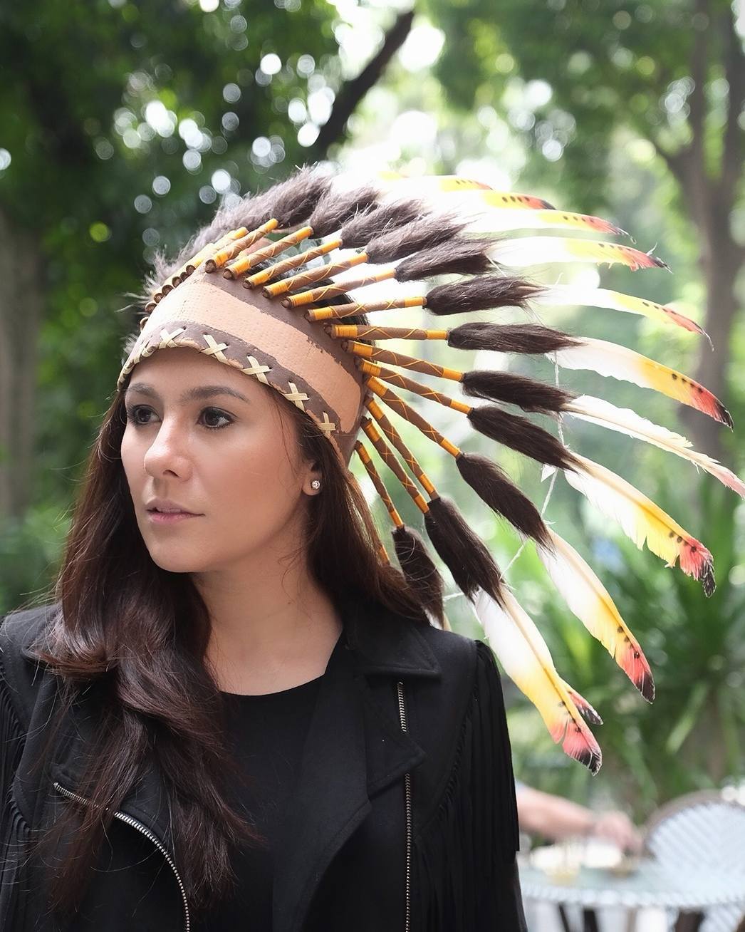 Wulan Gurtino tak dandan aneh-aneh saat merayakan Halloween. Ia memilih raiasan simpel ala Suku Indian seperti ini.
