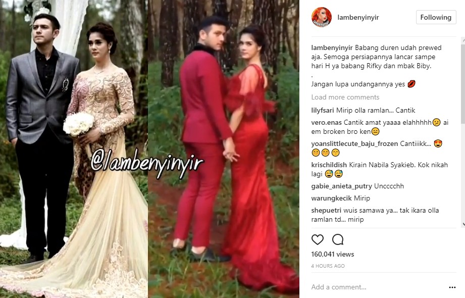 Hal tersebut bermula dari unggahan akun gosip @lambenyinyir. "Babang duren udah prewed aja. Semoga persiapannya lancar sampe hari H ya babang Rifky dan mbak Biby. Jangan lupa undangannya yes," tulis akun gosip tersebut dalam keterangan postingannya baru-baru ini.
