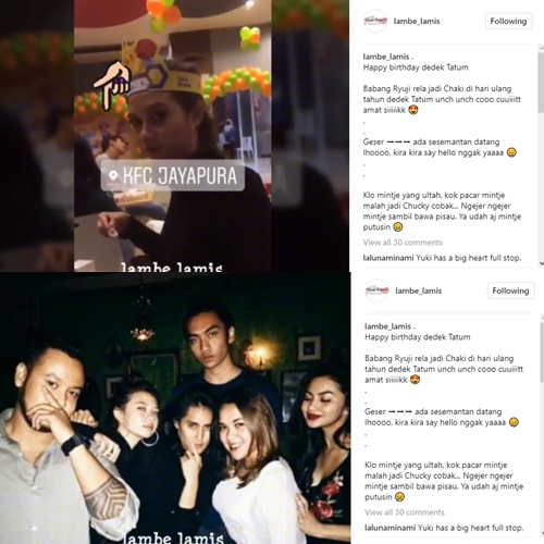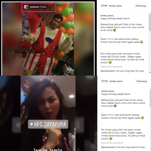 Sontak, postingan Ariel itu pun tak terlepas dari sorotan akun gosip @lambe_lamis. "Happy birthday dedek Tatum. Babang Ryuji rela jadi Chaki di hari ulang tahun dedek Tatum unch unch cooo cuuiiitt amat siiiiikk. ada sesemantan datang lhoooo, kira kira say hello nggak yaaaa," tulis akun gosip tersebut dalam keterangan postingannya.