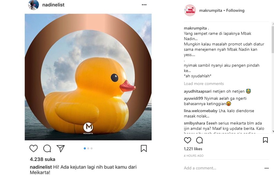 Jelas saja hal tersebut membuat tak sedikit netizen merasa miris dengan tindakan Nadine. Namun, ada pula netizen yang berpikir positif soal tindakan yang telah dilakukan Nadine itu. Hingga akhirnya, kehebohan tersebut ikut menarik perhatian akun gosip @makrumpita.