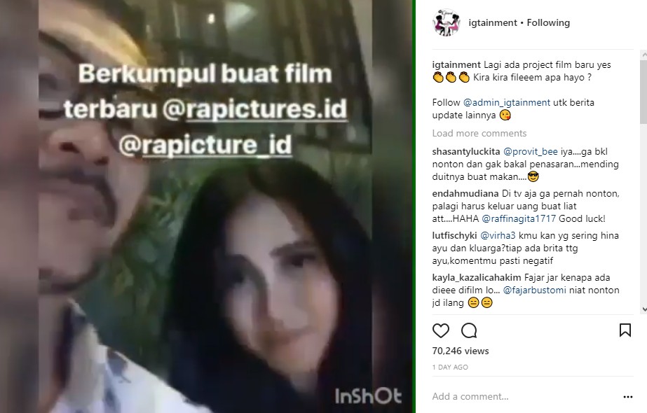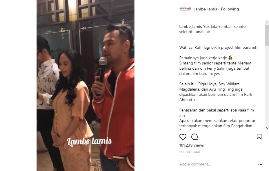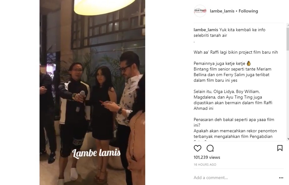 Kali ini, Raffi Ahmad bahkan membuat publik geger saat ia dikabarkan bermain di film yang sama dengan Ayu Ting Ting. Melalui postingan yang diunggah ulang oleh akun gosip @lambe_lamis, dikabarkan pula beberapa selebritis senior seperti Meriam Bellina dan Ferry Salim akan terlibat dalam film tersebut. Tak hanya itu, Magdalena, Boy William serta Olga Lydia pun turut menjadi bintang film yang disebut-sebut bergenre komedi.