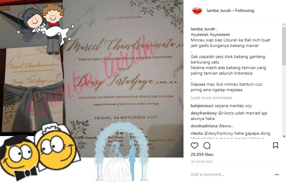 Dalam postingan tersebut, tertera nama Marcel Chandrawinata, S.T. dan Deasy Tirtadjaya, S.Sos., M.A. Tak hanya itu, dalam undangan yang ditulis dengan tinta emas tersebut juga menyebutkan bahwa pernikahan akan diselenggarakan pada 24 November 2017 mendatang. Sayangnya, untuk lokasi masih masih dirahasiakan.