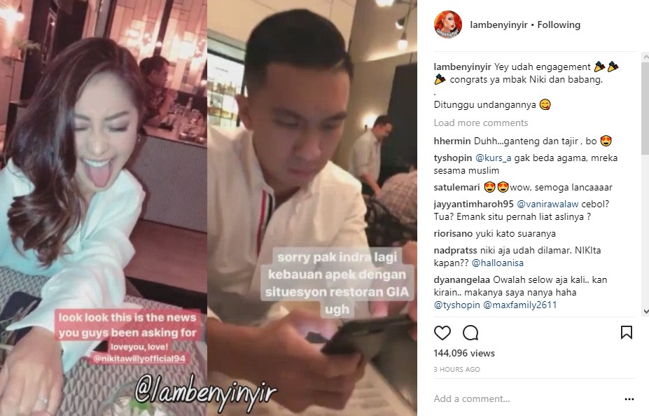 Sontak, postingan yang diunggah ulang oleh akun gosip @lambenyinyir itu pun menuai berbagai komentar. Bahkan, tak sedikit netizen tampak heboh serta mengucapkan selamat pada Nikita Willy dan Indra.