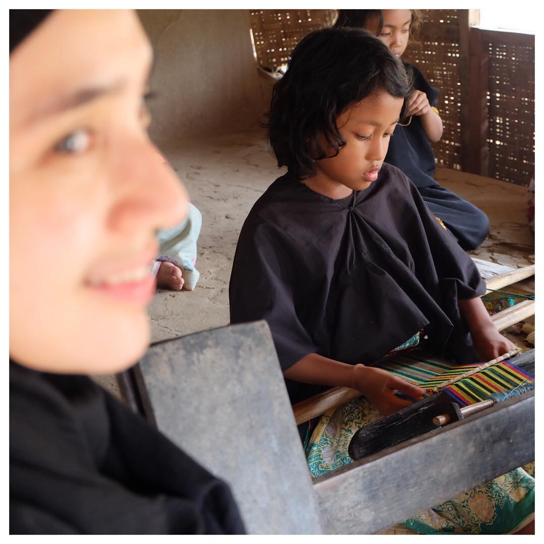 Dhini juga belajar menenun dengan mereka seperti ini lho...