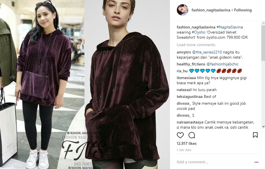 Namun, siapa sangka, kali ini Gigi kembali mengenakan jaket yang terbilang murah bagi kalangan selebritis dengan harta melimpah itu. "#NagitaSlavina wearing #Oysho 'Oversized Velvet Sweatshirt' from oysho.com 799.900 IDR," tulis akun @fashion_nagitaslavina dalam keterangan postingannya.