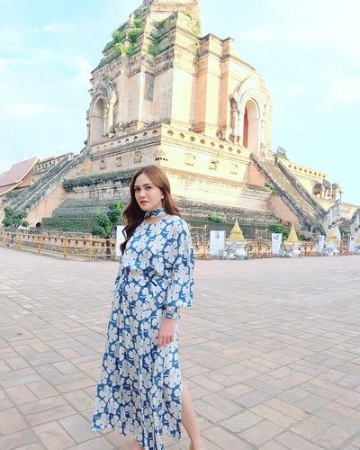 Mengenakan busana floral berwarna biru, Shandy nampak begitu anggun saat berpose di salah satu bangunan ikonik di Chiang Mai.