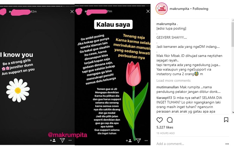 sontak, postingan yang diunggah ulang oleh akun gosip @makrumpita itu pun menuai berbagai komentar. Bahkan, tak sedikit netizen yang lagi-lagi melayangkan hujatan pada sang pemberi dukungan pada Jennifer. "Dari bahasanya keliatan orang yang gak berpendidikan, logic fallacy. Maklum kalo belain pelakor," kata @ani*****adiba. "Nii org pelakor juga kykx..mau di jambak juga kyk si jd neng," imbuh @jj****nty.