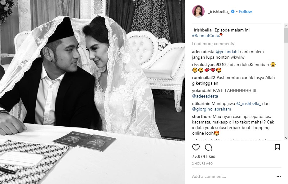 "Moga ga d, sinetron aja dunia nyata jg ya b, jodoh... Astungkara @giorgino_abraham @_irishbella_," harap @adie_tya_b*****g. "Kalian sllu bkin baper @_irishbella_ @giorgino_abraham ,,smoga langgeng kalian," kata @n*****ez. "Semua menjadi kenyataan yaa tuhann @_irishbella_ @giorgino_abraham," imbuh @y*****ntara. "Smoga d knyataan kalian menikah amin," timpal @ya*****n_27.