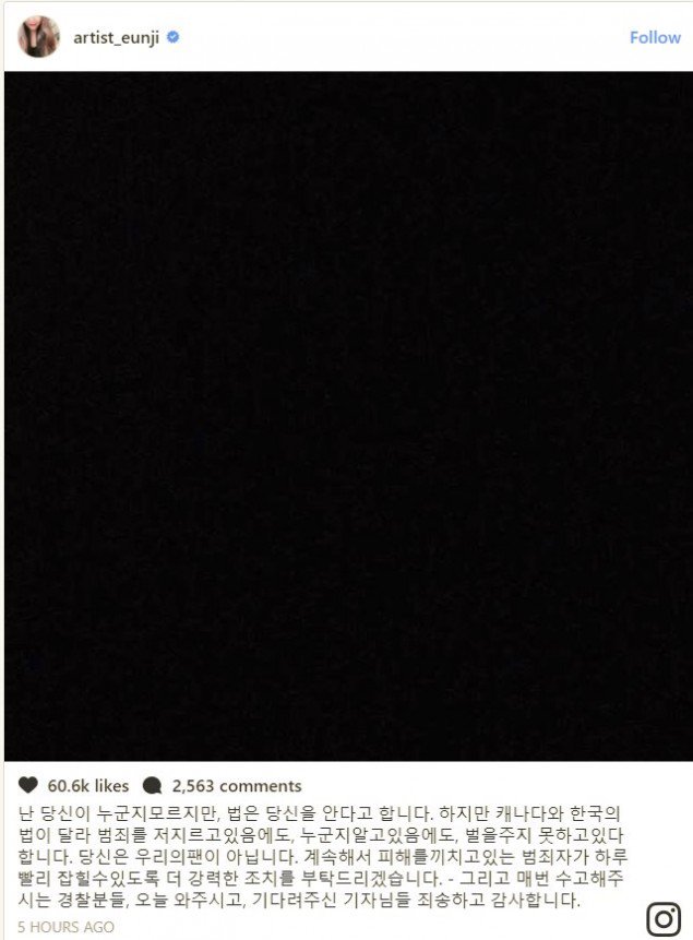 "Aku tidak tahu kamu siapa, tapi pihak kepolisian bilang mereka tahu siapa kamu," tulis Eun Ji di kolom caption postingannya tersebut. "Namun, hukum di Kanada dan Korea sangatlah berbeda. Jadi, meskipun kamu melakukan tindak kriminal, bahkan jika mereka tahu siapa kamu, mereka tidak bisa menghukummu."