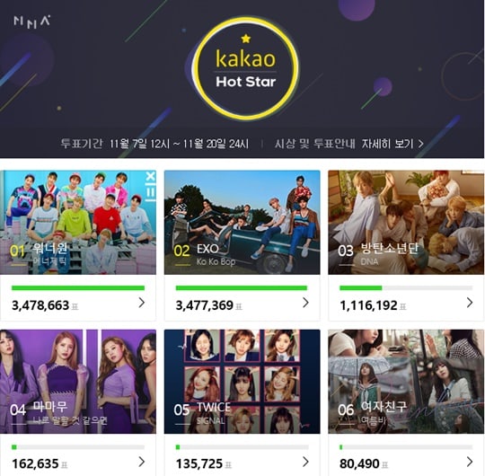 Grup rookie Wanna One meraih tempat pertama kategori “Kakao Hot Star”. Grup yang bernaung di YMC Entertainment ini berhasil mengalahkan grup populer EXO dan Bangtan Boys.