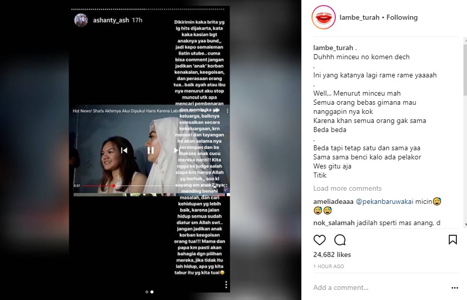 Ashanty berharap jika kedua orang tua Shafa dapat menyelesaikan masalah keluarga secara internal, bukan mengumbarnya. "baik ayah atau ibunya menurut aku stop muncul utk apa mencari pembenaran dan membuka aib keluarga, baiknya selesaikan secara kekeluargaan, krna memori dan tayangan ini akan selamanya tersimpan dan bs diakses anak cucu mereka nanti!! Kita ngga bisa judge salah siapa krna hanya Allah yg berhak,, soo kalo sayang sm anak2 nya mending benahi masalah, dan cari kehidupan yg lebih baik, karena jalan hidup semua sudah diatur sm Allah swt..jangan jadikan anak korban keegoisan orang tua!!! Mama dan papa km pasti akan bahagia dgn pilihan mereka, jika tidak itu lah hidup, apa yg kita tabur itu yg kita tuai," imbuh Ashanty.