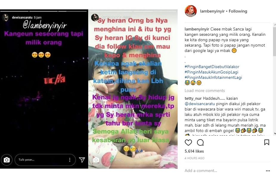 Postingan yang diunggah ulang oleh akun gosip @lambenyinyir itu pun membuat heboh netizen. Terlebih soal pengakuan Dewi Sanca yang menyukai milik orang lain. "Cieee mbak Sanca lagi kangen seseorang yang milik orang. Kenalin ke kita dong papap nya siapa yang sekarang. Tapi foto si papap jangan nyomot dari google lagi ya mbak," sindir akun gosip tersebut dalam keterangan postingannya, Kamis, 23 November.