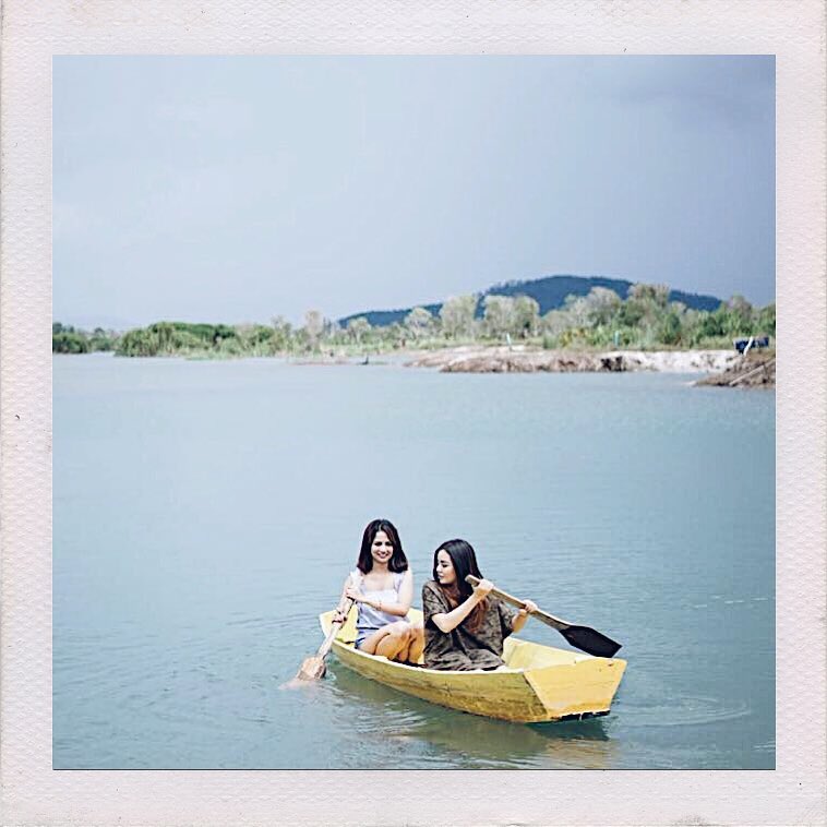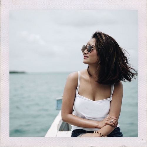 Menaiki sebuah kano kecil, Vanessa enjoy menikmati angin laut yang menerpa rambut pendeknya.