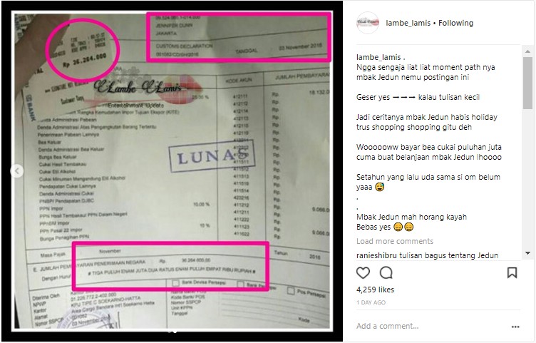 "Ngga sengaja liat liat moment path nya mbak Jedun nemu postingan ini," bunyi keterangan yang dituliskan akun tersebut. "Jadi ceritanya mbak Jedun habis holiday trus shopping shopping gitu deh. Woooooww bayar bea cukai puluhan juta cuma buat belanjaan mbak Jedun lhoooo. Setahun yang lalu uda sama si om belum yaaa. Mbak Jedun mah horang kayah. Bebas yes, imbuhnya lagi.